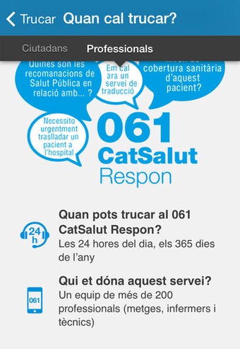061 CatSalut Respon es la app oficial del Servei Català de la Salut. Con esta aplicación podrás informarte sobre cuestiones relacionadas con la salud e incluso ponerte en contacto con las autoridades sanitarias en Cataluña en caso de emergencia.